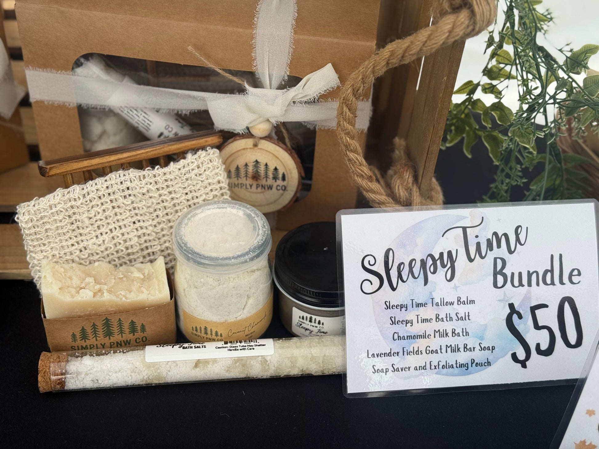 Get ready for a serene slumber with our Sleepy Time Bundle. Unwind with our sleep-inducing balm and tranquilizing bath salts. Complete the experience with a calming coconut chamomile milk bath and our luxurious lavender fields goat milk bar soap. Keep your soap fresh and exfoliate at the same time with our handy soap saver and pouch. All wrapped up in a cute gift box complete with a ribbon and wooden tag. Sweet dreams guaranteed (well, we can't guarantee that last part).